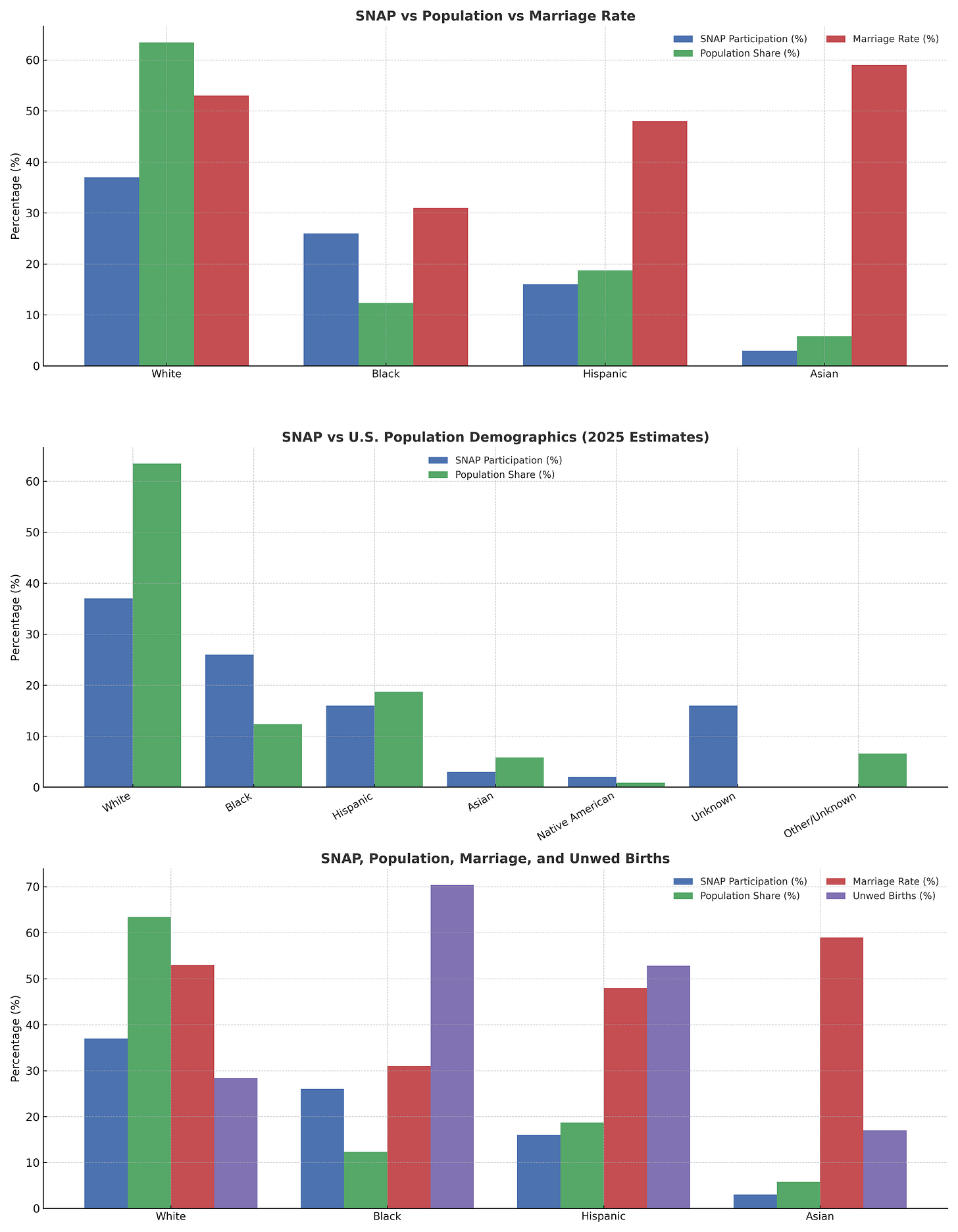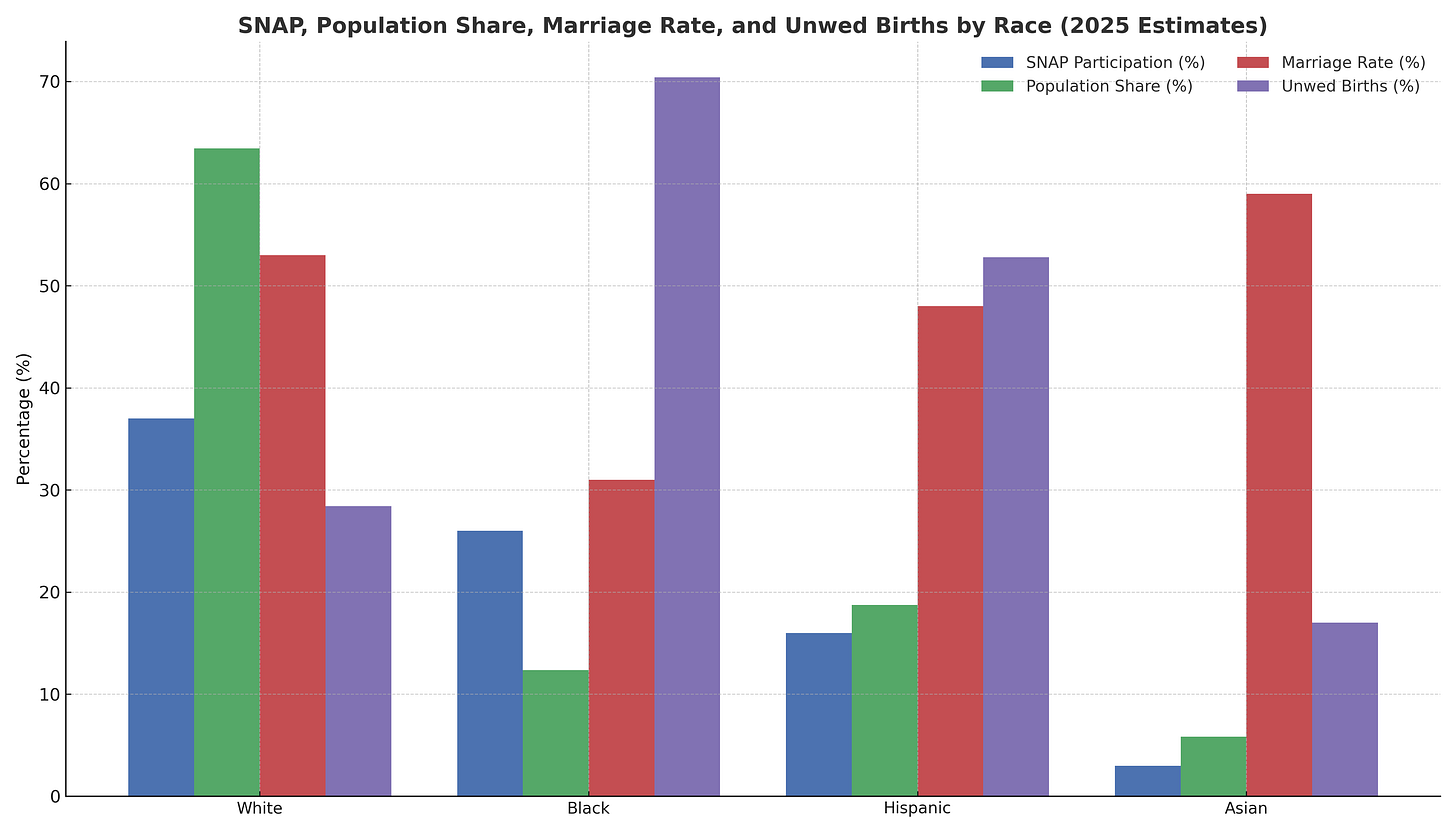 Now the full picture: marriage collapses where unwed births soar. Over 70% of Black children and over half of Hispanic children are born outside marriage. Pair that with high SNAP participation, and you see the trap; broken homes subsidized by government checks, locking families into dependency.