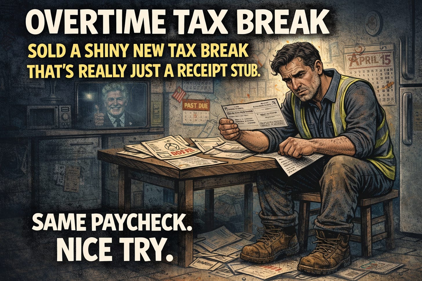 Spoiler: Your “overtime tax break” is just a refund delay in a flag-wrapped costume — sold by the same jokers who still can’t define “woman,” “recession,” or “truth.”
